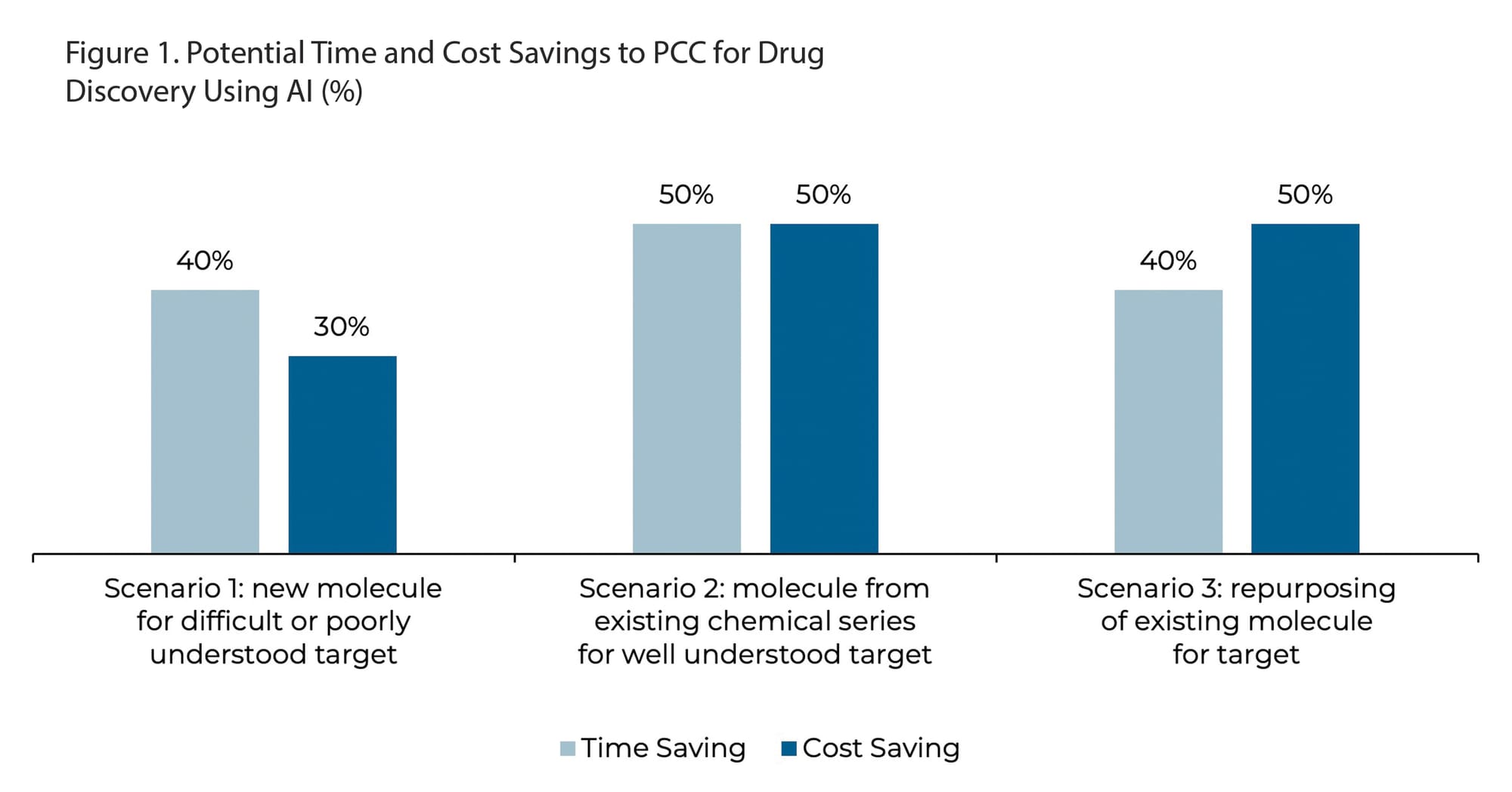 In addition to expediting processes, AI presents huge opportunity to drive cost savings: According to U.K.-based health research foundation Wellcome Trust, AI-based drug discovery could help to save up to 50% of the time and cost for a molecule to reach the preclinical candidate (PCC) stage (shown in Figure 1).
