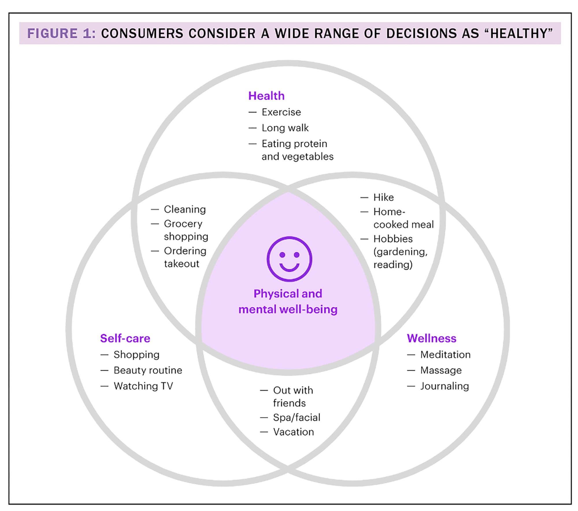 Health is personal, emotional and complicated. As the definition of health continues to blur, consumers can frame many different decisions as healthy, from cooking at home to ordering takeout, from meditating to watching TV (see figure 1).