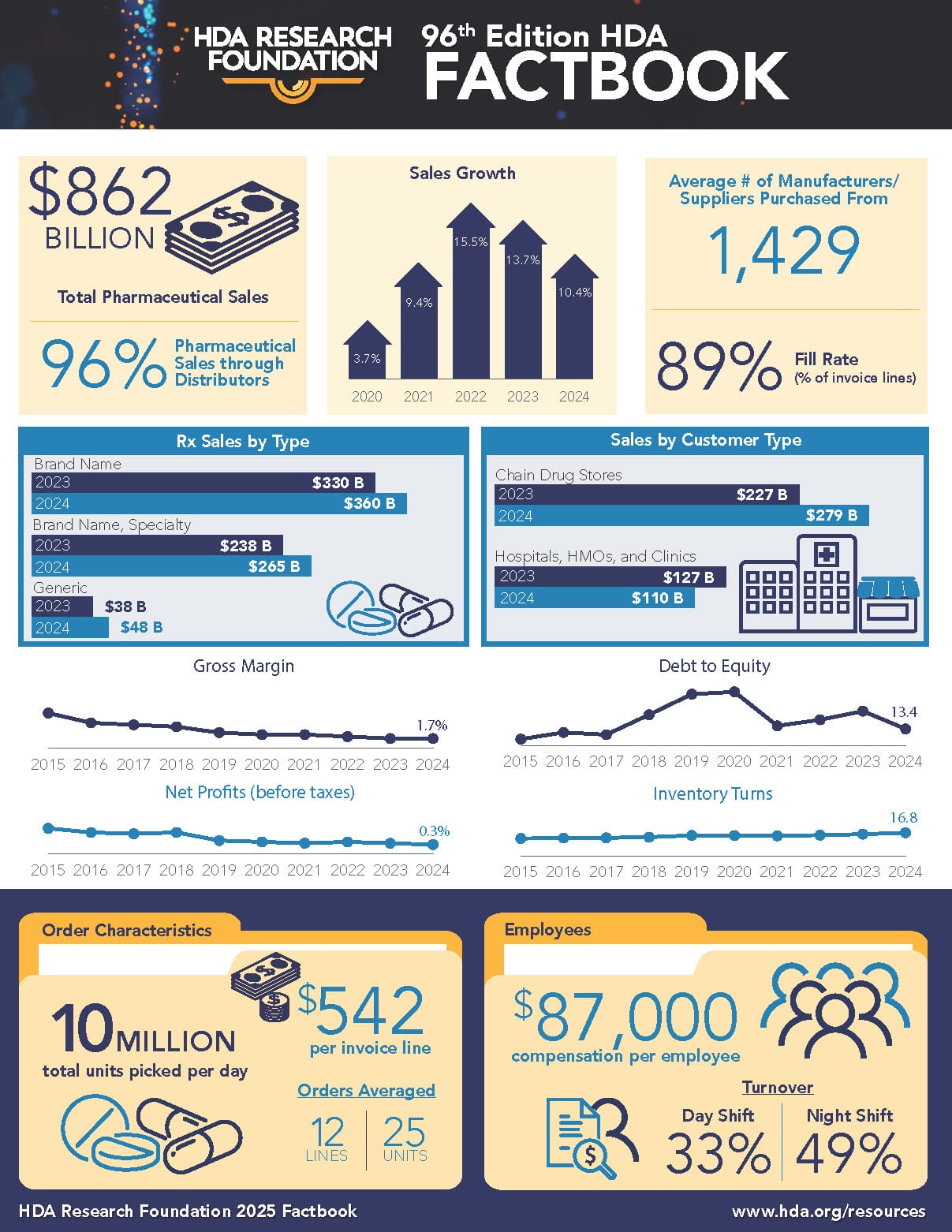 WASHINGTON — The Healthcare Distribution Alliance (HDA) Research Foundation has its 96th Edition , showing that U.S. pharmaceutical distributors generated $862 billion in sales in 2024, a 10.4 percent increase over the prior year. Those sales accounted for 96 percent of all prescription drug purchases, underscoring the central role of distributors in the healthcare supply chain.